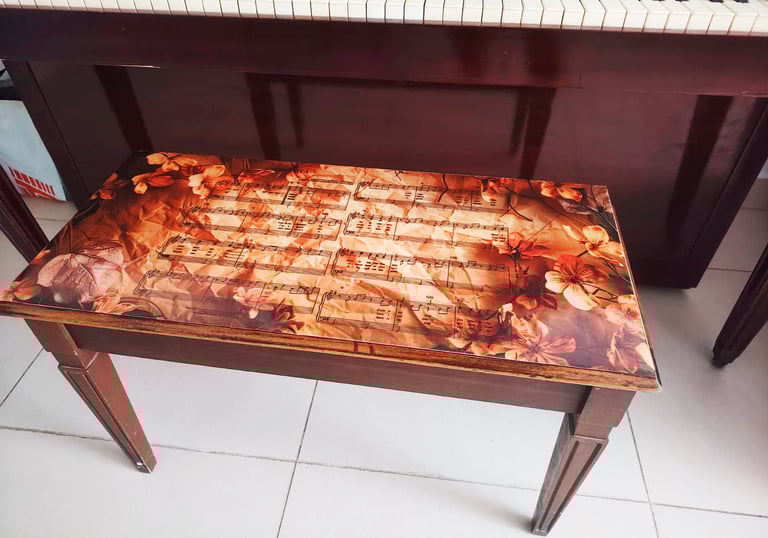 Devolvemos vida y brillo a pisos y muebles con cuidado y precisión. En la imagen un banco de piano restaurado con resina.